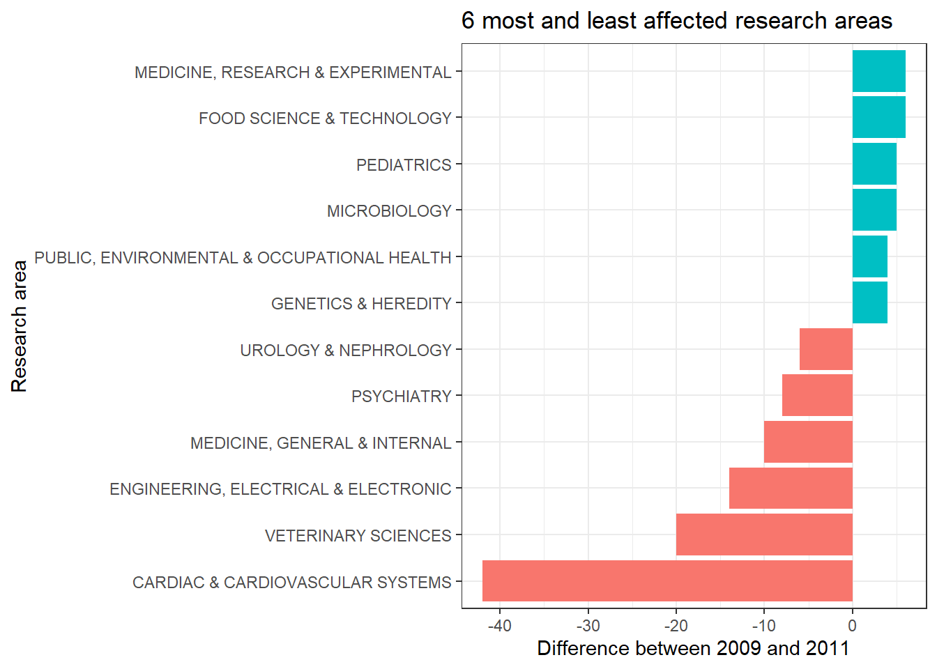 Yeah, we can see cardiovascular sciences and engineering took the biggest hit, however, some of the research areas have produced more papers! I could probably investigate this further by building a linear model and then checking residuals, but this is fine as it is.