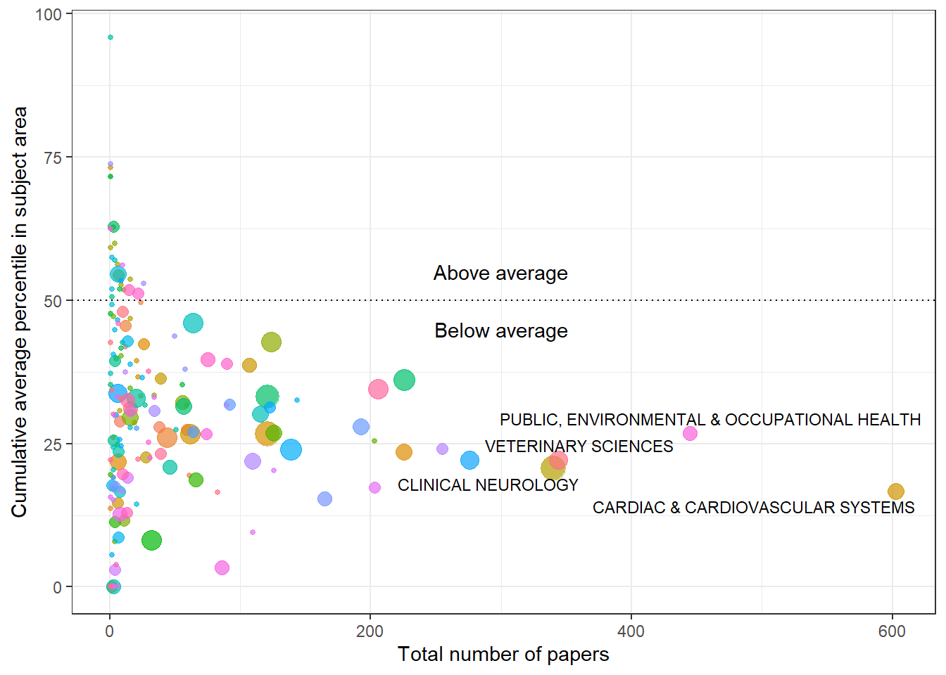 The plot below shows the cumulative number of papers (x axis) against the cumulative average percentile in the subject area (y axis) for each research area, at the latest available year. The largest research areas are labelled:
