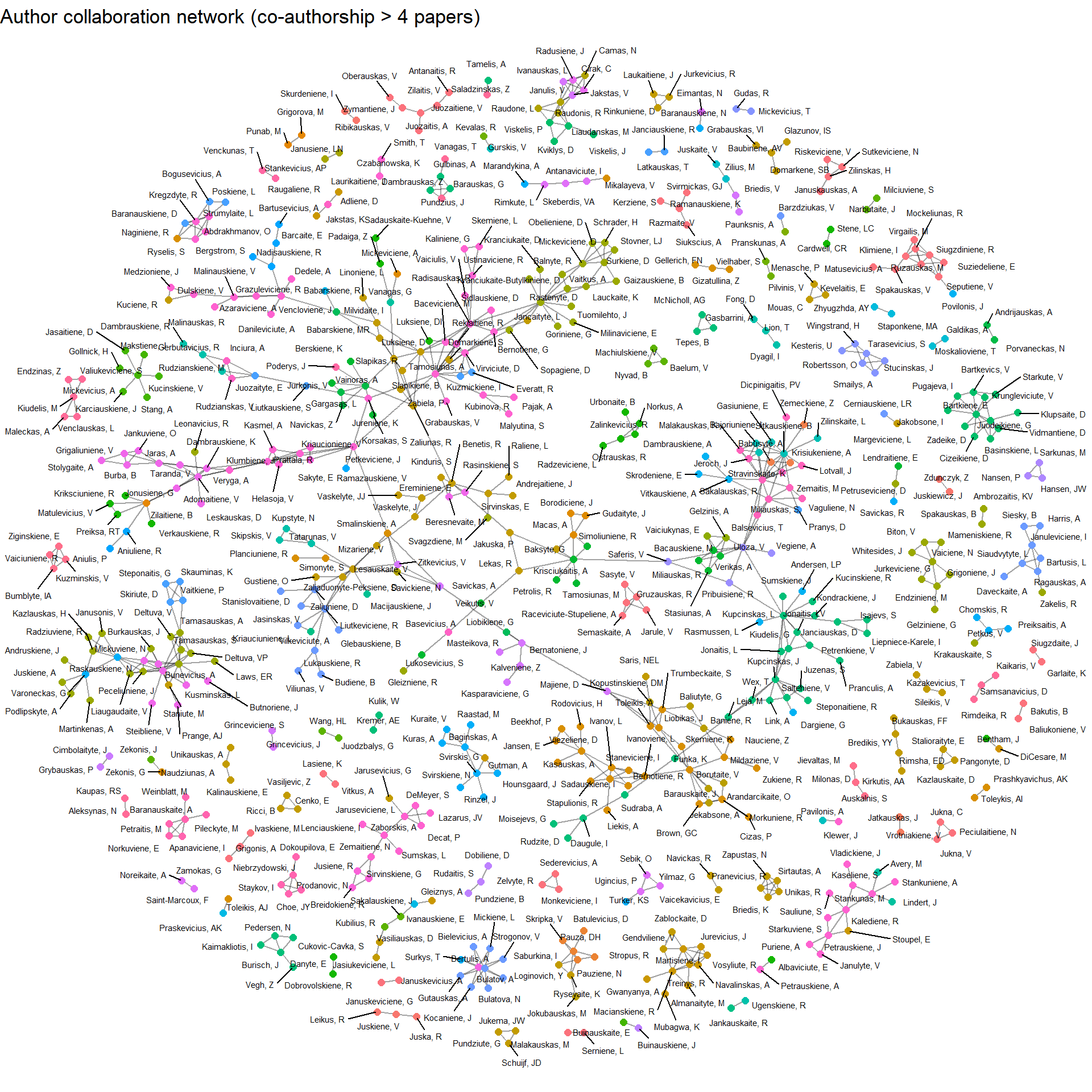 Since the publications have authors listed alongside in the data, I would like to know whether research groups work independently or cooperate with other groups. Unfortunately, InCites provides only the first 5 authors of each paper. Obviously, this means that we lose any information about authors who are credited after the fifth author. But more importantly, usually papers list the supervisor as the last author. This means that some of the most important connections between authors may become lost. This may cause some of the author clusters to be isolated when in fact they are connected by someone. Finally, I have added a threshold of 4 publications to show common authorship. Adding more produced a highly interconnected plot that was hard to parse. With these caveats in mind, let’s look at clusters of authors!