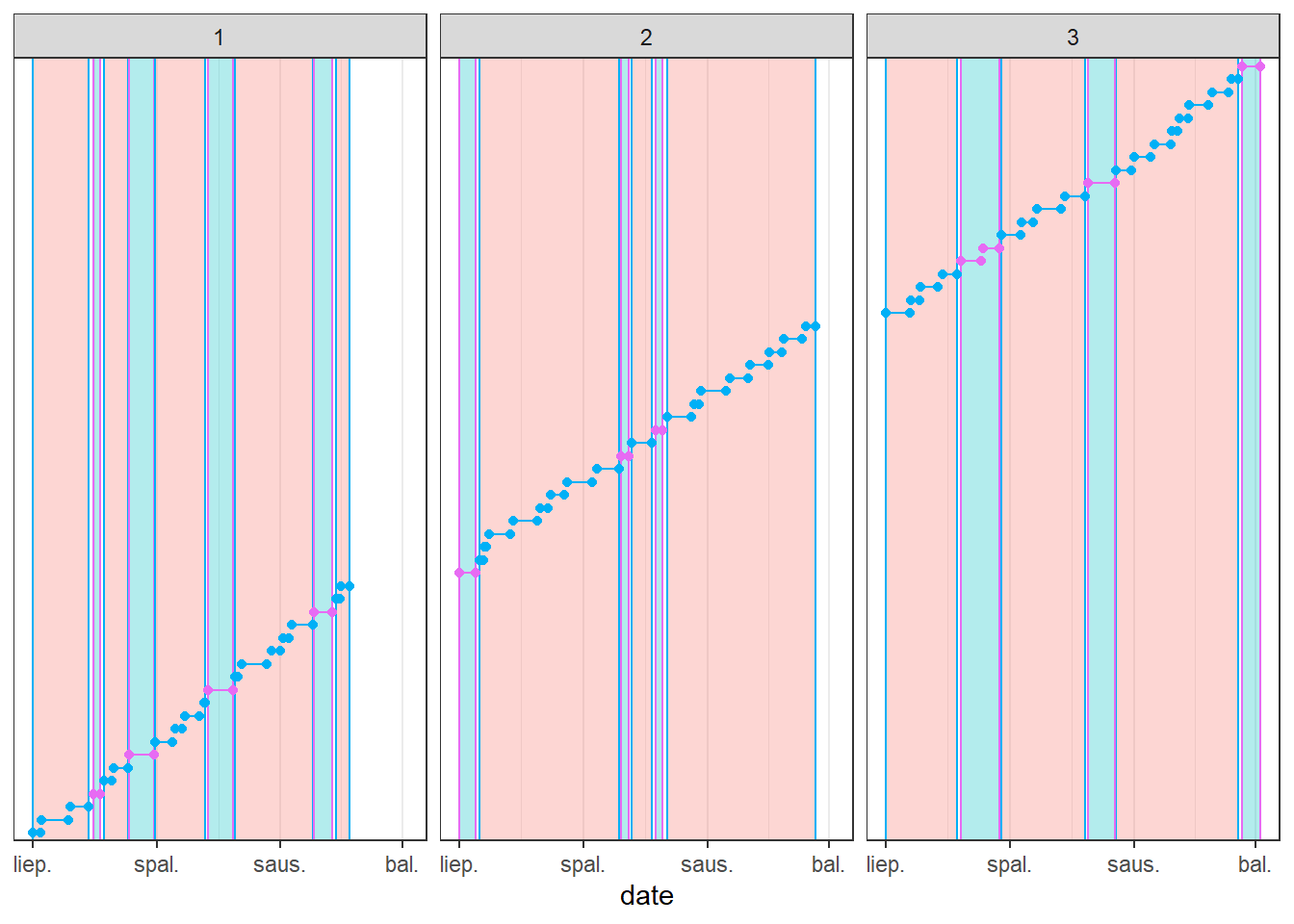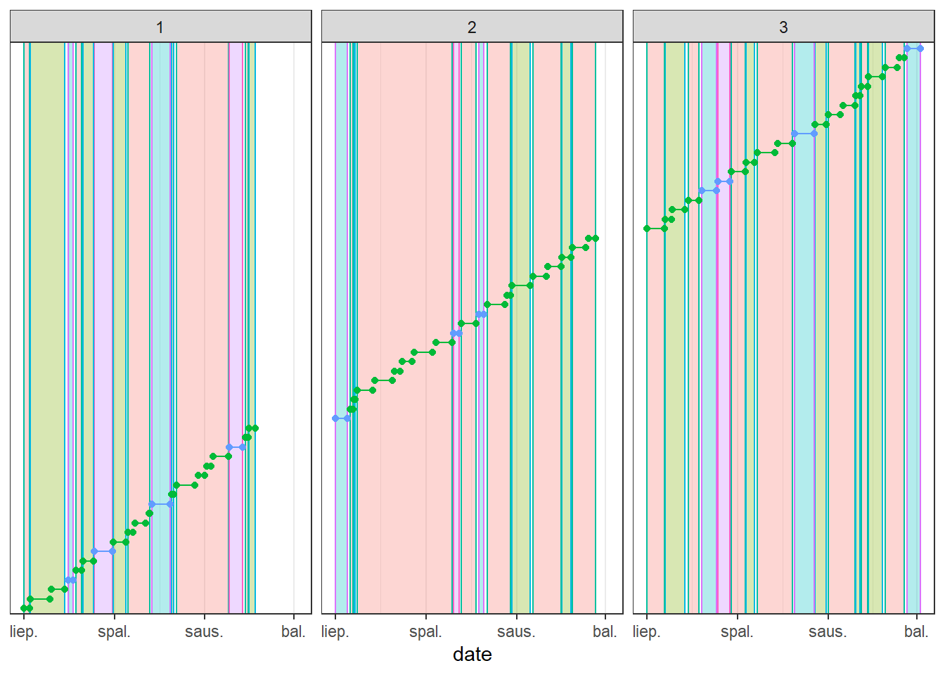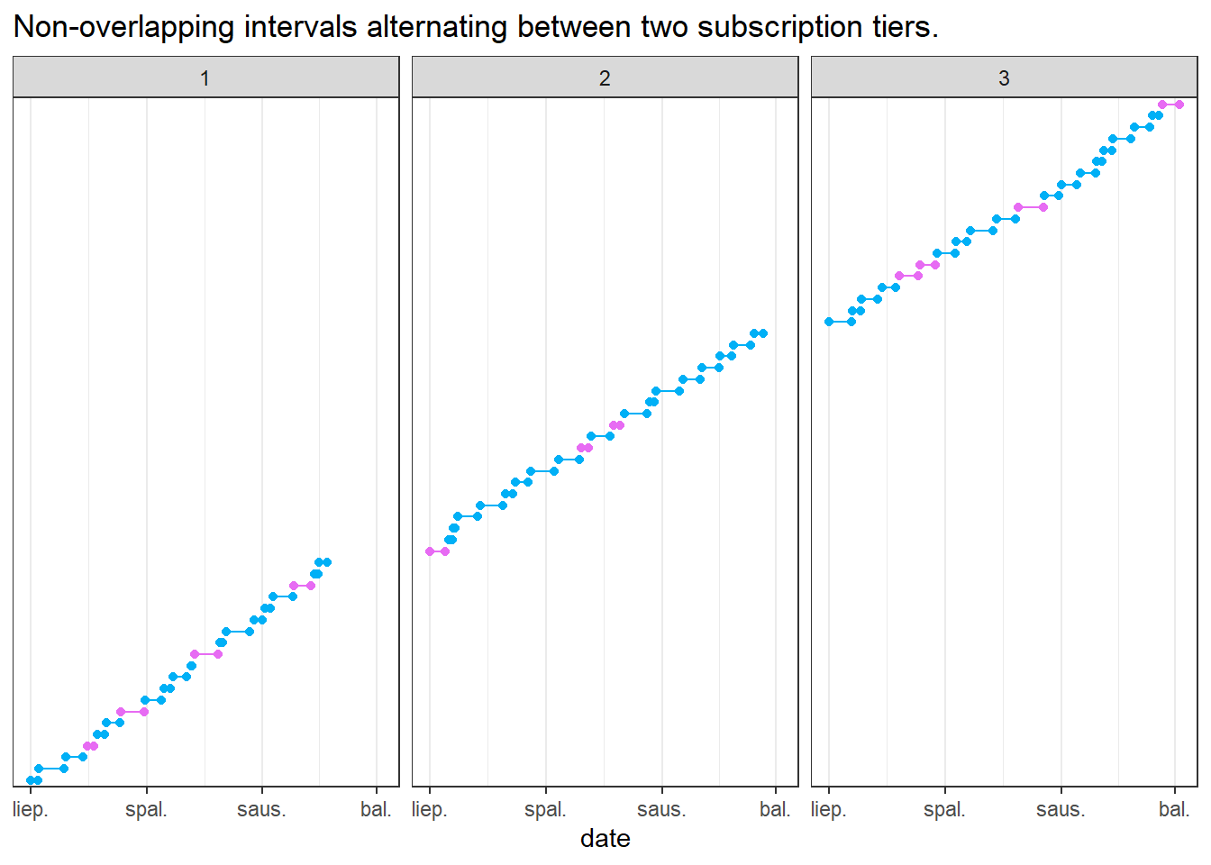 con <-dbConnect(duckdb::duckdb())source("../grouping-overlapping-date-ranges/functions.R")consecutive_dates <-generate_intervals(groups =3, duration =20, gaps =3, n =20) %>%mutate(tier =sample(c("Free","Premium"), size =20, replace =TRUE, prob =c(0.8,0.2)))p1 <- consecutive_dates %>%plot_timeline() +geom_point(aes(color = tier)) +geom_line(aes(color = tier)) +facet_grid(~group_id) +labs(title ="Non-overlapping intervals alternating between two subscription tiers.")